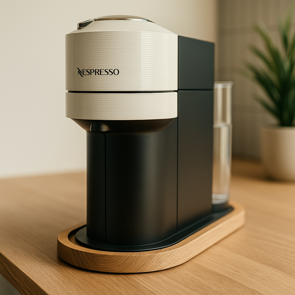 The warm grain of the wood contrasts beautifully with the modern design of the Vertuo, turning a functional fix into a countertop centerpiece.